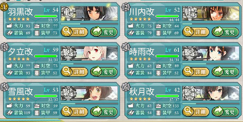 数日前からやっていました。主に、昨日のお休みでボスゲージを削ったのですが。 編成は最終的に水上打撃部隊