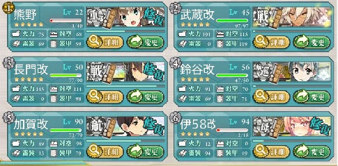 ここまで順調すぎるので、E5は、甲レベルで挑戦する事にしました! まだ時間と資源は残ってるので、少しぐらいはダメ元でチャレンジです。 編成は・・