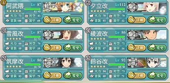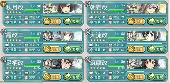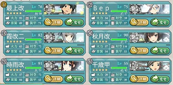 E2は礼号組4隻でルート固定という、当鎮守府のためのルールじゃないかと思える温情策で、従来から練弩向上を図ってきた艦のみで行けました。 E1でドロップした清霜はレベル的に出してません。