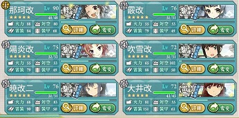 駆逐艦5人でルート固定と言う事なので、駆逐艦多めです。 その駆逐艦も次(E3?)で輸送支援艦隊が来るみたいなので、ある程度温存してレベル70程度の駆逐艦 でもBチームであって、Cチームじゃないのですよね。似た艦種の構成が3つだと丙に落とすしか無さそう。E5やE6の情報が、まだ少なくて・・、どうなる事やら・・