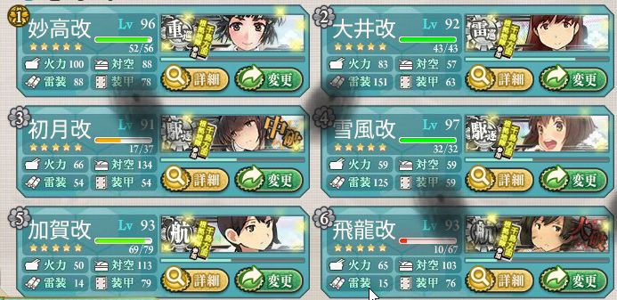 妙高 20(3) 20(3) 夜偵 探照灯 大井(2) 20(3) 20(3) 甲 初月 10高 10高 13号改 雪風 魚雷x3 加賀(2) 艦攻 戦x3 飛龍(2) 艦攻 戦x2 彩雲カロ