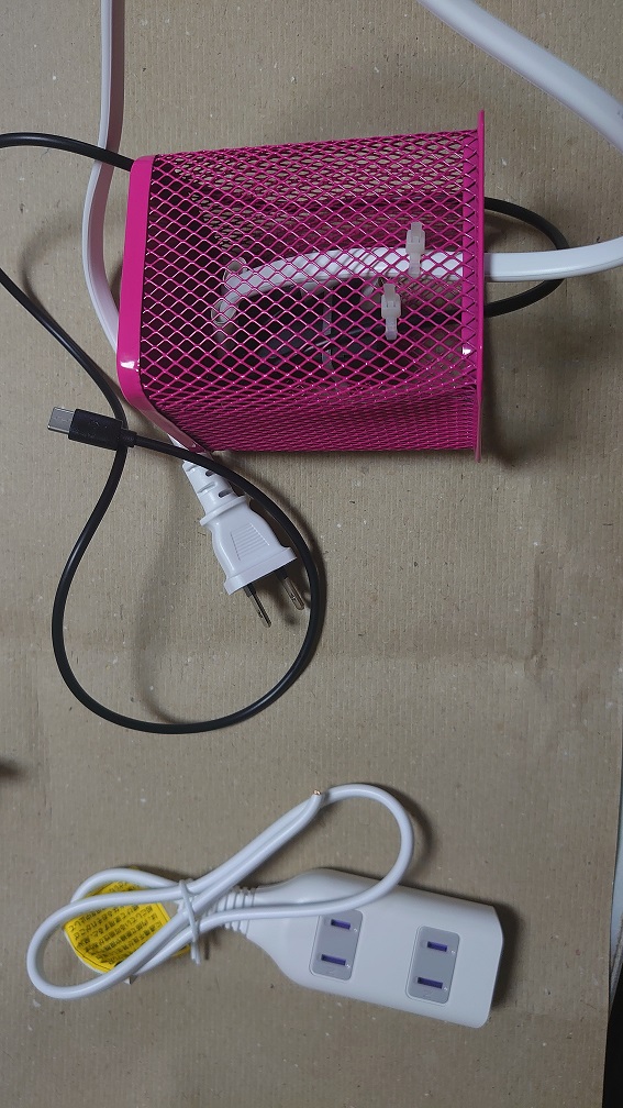 組み込み用の電源に、100均で買ったテーブルタップ(300円)をブチ切ったACコードと、USB-Cケーブル(100円)をはんだ付け  文房具の籠(100円)の中に、結束バンドで止めたもの……
